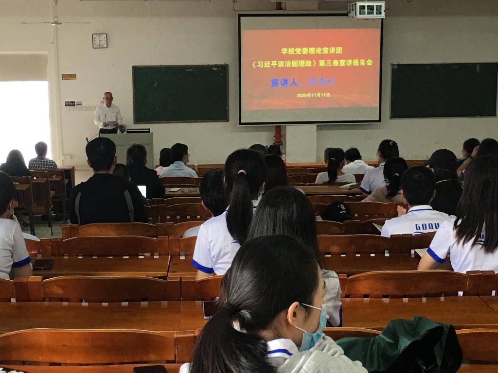 2020年11月11日,学校党委理论宣讲团成员陈青松教授在二教B5202为学院全体教职工,青马班同学进行《习近平谈治国理政》第三卷宣讲。陈教授从以下四点做了讲授,一、《习近平谈治国理政》第三卷的历史背景和实践基础;二、《习近平谈治国理政》第三卷主要内容和逻辑结构;三、《习近平谈治国理政》第三卷重要意义;四、如何深入学习《习近平谈治国理政》第三卷。