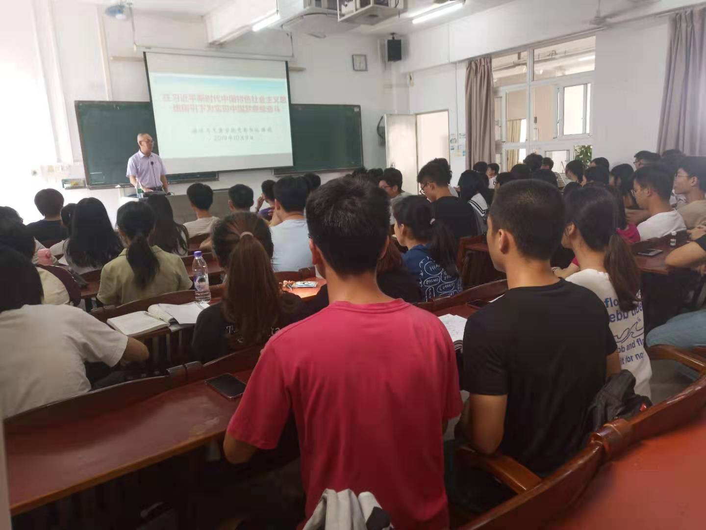 今年是中华人民共和国成立70周年。70年峥嵘岁月,70年玉汝于成,中国共产党团结带领中国人民实现了中华民族有史以来最为广泛而深刻的社会变革,实现了中华民族由近代不断衰落到根本扭转命运、持续走向繁荣富裕的历史性变迁,实现了中国人民和中华民族从站起来、富起来到强起来的伟大飞跃。陈晓为同学们讲述了新中国成立70周年所取得的伟大成就,分享了学习中共中央总书记、国家主席、中央军委主席习近平发表重要讲话精神的体会和观看中华人民共和国成立70周年大会直播实况的感受,结合学校和学院的实际情况,提出贯彻落实学校第四次党代会精神的要求,鼓励同学们努力学习,立志成才,在习近平新时代中国特色社会主义思想指引下,为实现中国梦继续奋斗!