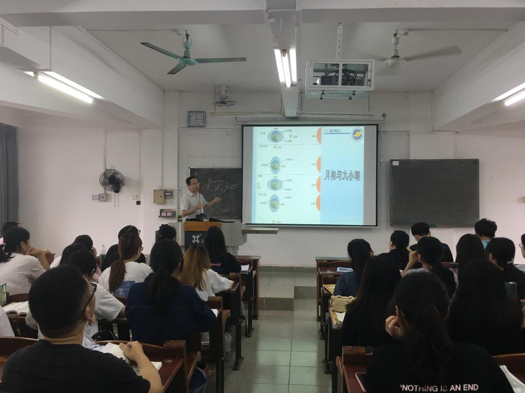 曹瑞雪老师以《海洋科学导论》中的“第七章 潮汐”展开授课,首先,对前次课的课后作业的易错点进行讲解,然后用多媒体与板书相结合的授课方式,从复习回顾前面章节知识点导入,讲授了潮汐的定义、研究意义和潮汐相关天文学知识。并联系实际,让学生在课堂演示天体运行规律,生动形象的演示了和潮汐相关的天文知识,并进行现场课程测试,让学生对潮汐相关的知识掌握的更加牢固。