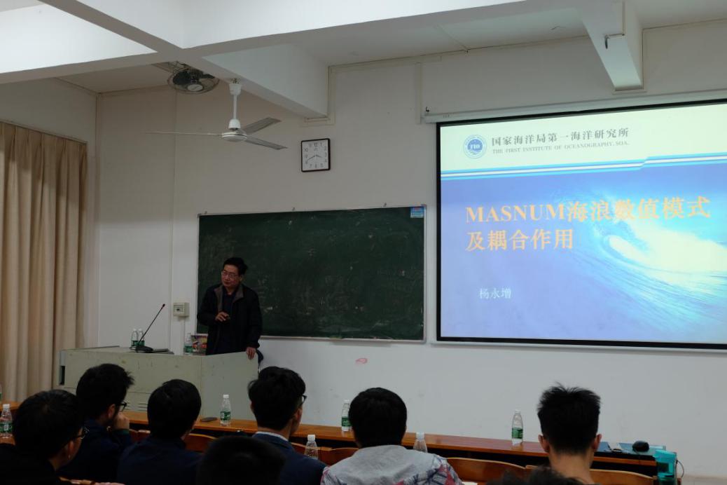 上午,两位专家与学院张书文院长、徐建军教授、凌征研究员在海博楼会议室就“海洋上层混合过程参数化及实验验证”课题进行研讨,对课题进展提出了很多宝贵的意见。下午,侯一筠研究员与杨永增研究员在第二教学楼B1202分别作学术报告,报告厅座无虚席,学院100余名教师、研究生和本科生现场聆听了报告。侯一筠研究员在所做的题为《全球气候变化下的海气耦合系统》的报告中指出了海洋动力研究的重要性与实用性,并由浅到深的介绍了当前背景下的海气耦合系统;杨永增研究员则做了题为《MASNUM海浪数值模式及耦合作用》的报告,系统介绍了MASNUM海浪数值模式的定位、发展目标与应用。