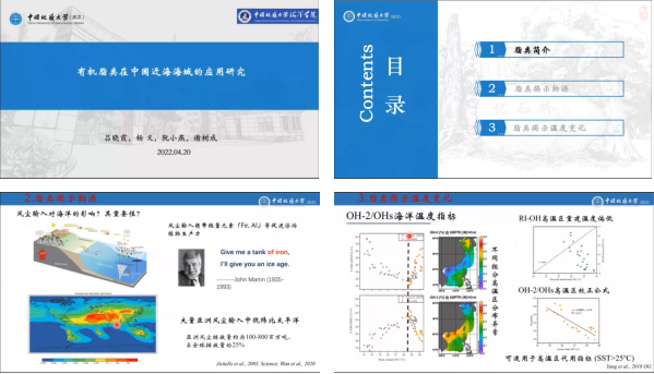 吕晓霞教授作了题为“有机脂类在中国近海海域的应用研究 ”的学术报告。吕教授的报告主要围绕中国近海海域有机脂类的应用研究展开,旨在阐明当前有机脂类研究现状与应用前景。吕教授先是为我们简单介绍了脂类的定义与分类,揭示了海洋沉积的有机物来源,进而吕教授以南海的风尘输入为例简要介绍了其团队目前所做脂类揭示物源的相关研究。其次,吕教授阐述了脂类揭示温度变化的研究,并介绍了陆缘输入较高的边缘海域与高温海域所使用的不同温度指标。