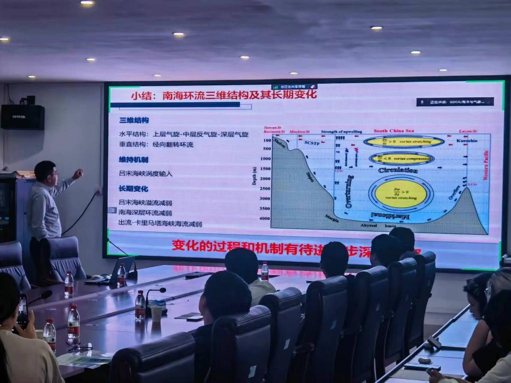 魏泽勋研究员报告题目为:南海海洋环流三维结构与变化及其相关动力学机制。他系统地介绍了南海的整体环流。南海作为一个既封闭又连通的海域,同时是连接太平洋-印度洋贯穿流的重要分支,具有重要的科学意义。并指出吕宋海峡涡度输入是维持南海水平环流上、中、深三层呈现“气旋式-反气旋式-气旋式”三明治结构的重要机制。南海作为“小大西洋”,其垂向结构存在两个经向翻转环流,分别是由季风引起的具有冬季向南、夏季向北的季节变化特征的表层经向流与次表层以下反向的补偿流形成的上、中层季节性翻转和1000m以深的不随季节变化的深层翻转流。同时,魏老师还介绍了南海深层环流的时间尺度和空间尺度季节变化特征和长期变化特征,以及南部海峡与大洋之间的水交换。