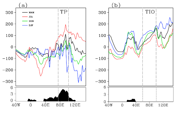 本研究发现青藏高原(TP)与热带印度洋(TIO)夏季均为强的热源区,热力对比最明显。两个强热源区分别位于SASM对应的强斜压区的北侧和南侧,且这两个热源均由对流层上层的深对流加热控制。夏季TP和TIO的热力对比通过对流层上层的经向温度梯度影响南亚季风环流。当热力对比显著增大时,温度经向梯度增大,低空西风气流和高空东风气流增强,进一步导致SASM区域大气斜压性增强,季风环流增强使得孟加拉湾和印度北部及中南半岛部分地区降水增加。