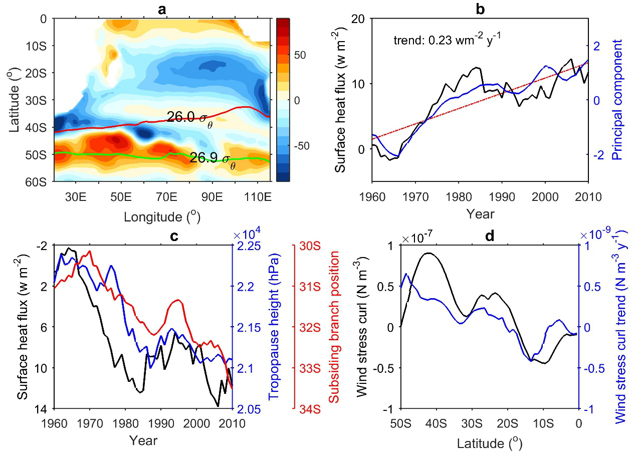 我院物理海洋学团队基于一系列再分析资料、模式输出和观测资料,发现南大洋正在经历的显著增暖可通过两种途径影响南印度洋次表层海水的热量再分配过程。首先,南大洋海表净热通量的增加导致了表层海水的增暖和局地更为深厚的对流层,通过抑制热带外大气的斜压不稳定迫使Hadley环流下沉支/西风带南移,进而在风应力旋度的驱动下整个副热带环流圈向极地偏移(图2),这导致南印度洋海水在位势密度槽的向赤道一侧变冷,向极地一侧变暖,产生图1所示的时空分布。