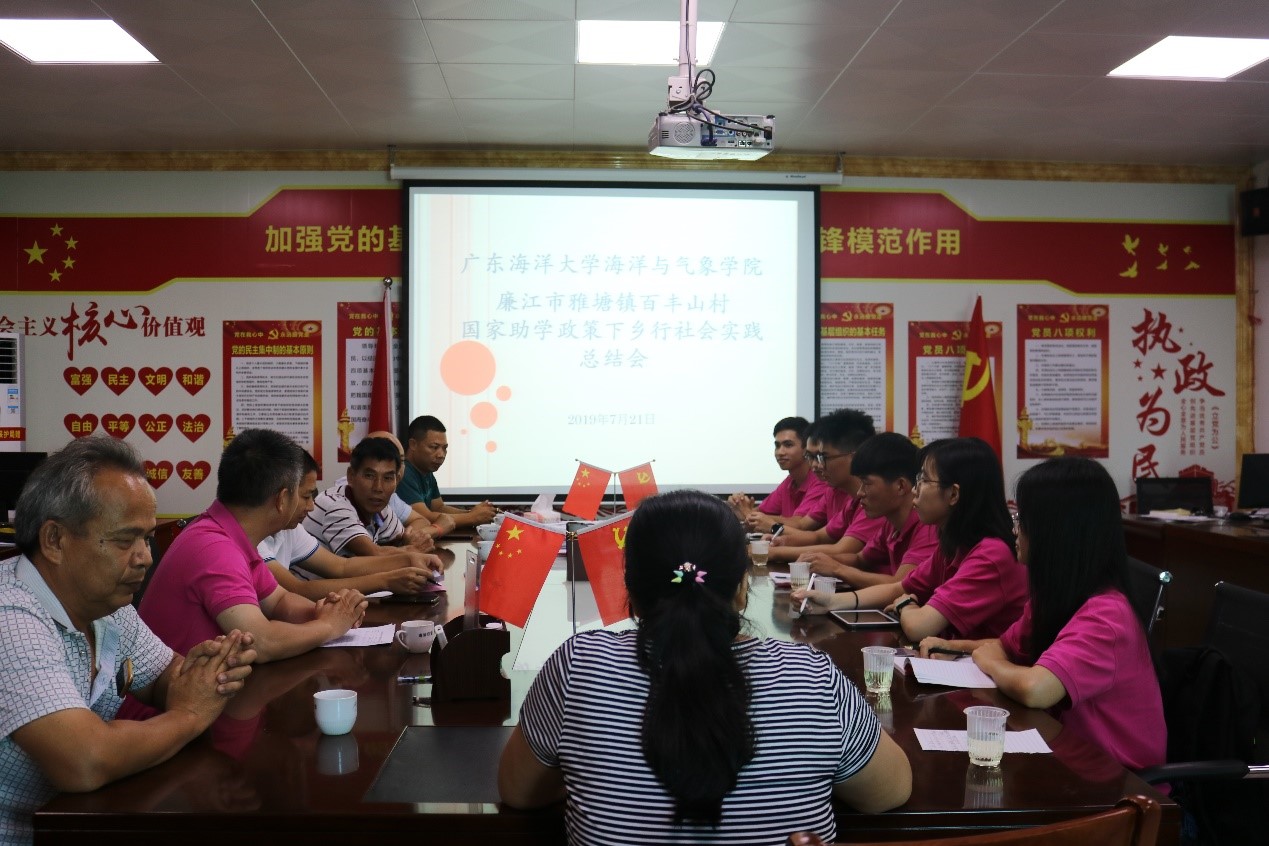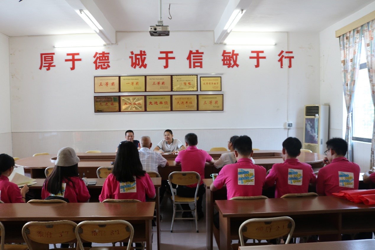 在“社会实践总结会”上,“爱的传承”团队走访美丽乡村,宣传助学政策,及时将调研数据、结果及建议反映给雅塘镇政府、百丰山村村委干部,以期为当地的教育资助、智力扶贫提供新方法、新思路。