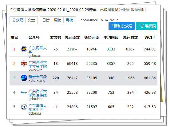 同时,工作室继续做好“新云天气象”公众号的运营,建立师生工作微信群,通过在线采编,集思广益,推送了《坚守!中南地区疫情防控通用航空气象服务平台上线!》《广东省气象大喇叭打通乡村防疫宣传“最后一公里”》等介绍气象人抗击疫情事迹的文章。公众号2020年2月共发布推送文章220篇,实现总阅读数超7.6万人次,微信影响力指数(WCI)达461分,成功进入我校微信榜单前三名,建成全国气象业内有较大影响力的自媒体平台,促进了学院创新创业氛围的形成。