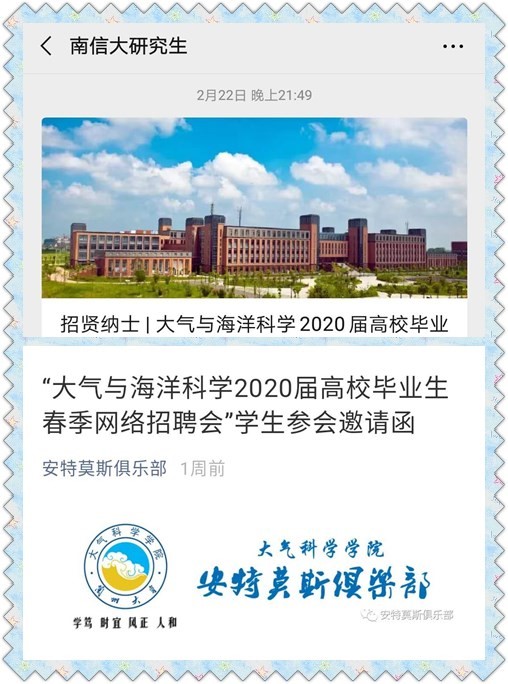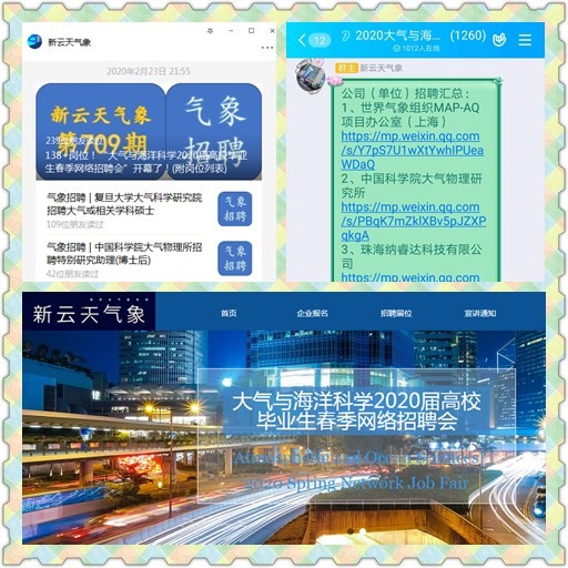 2月23日起,根据中央、广东省和学校对毕业生就业工作的相关要求,新云天气象工作室举办的“大气与海洋科学2020届高校毕业生春季网络招聘会”通过互联网正式开幕,为2020春季全国首个大气与海洋类招聘会。工作室全体同学及校内外导师克服部分企事业单位尚未复工等困难,成功邀请到复旦大学大气研究院、中科院大气所、南信大气象科技研究院、粤港澳大湾区气象监测预警预报中心、象辑科技、中科三清等12家知名企事业单位进入通过“新云天气象”微信公众号、QQ群和网站(http://www.xytqx.com/)搭建的虚拟展位,开展“空中宣讲”“在线面试”等招聘活动,提供高质量就业岗位近200个,涵盖大气科学、海洋科学等英国威廉集团官网优势专业,也覆盖计算机类、数理类、资环类、文管类等通用专业。