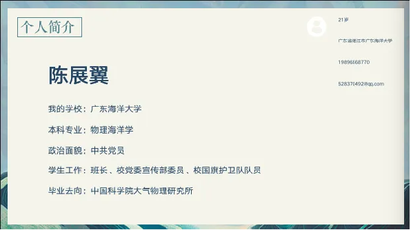 第二位分享保研经验的是推免至中国科学院大学,物理海洋学专业的徐进学长陈展翼。先是向我们传递保研的具体概念,在此基础上细化保研的要求,为我们探清未来之路,同时也向我们提出三年磨一剑,要保证学业水平,多多参与学科竞赛,科研创新;提高思想道德。还有对自我的定位,强调学业重要;最后告诉我们一定要有毅力,坚持不懈的走下去。