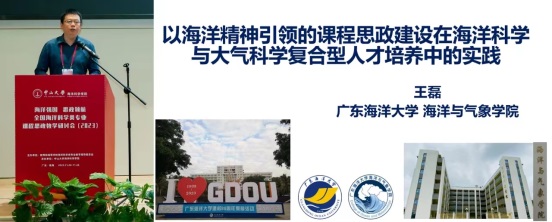 本次会议以“海洋科学类专业课程思政教学”为主题,来自中山大学、中国海洋大学、浙江海洋大学、江苏海洋大学、国防科技大学、中国地质大学、大连海洋大学、大连海事大学、汕头大学和海洋二所等专家进行了精彩的专题报告与经验分享。我校王磊老师以“海洋精神引领的课程思政建设在海洋科学与大气科学复合型人才培养中的实践”为题作报告,宁浩老师以“基于OBE教育理念的流体力学课程思政探讨”为题作报告,集中展示了近年来我校海洋科学专业在思政教育与专业教育融合的工作亮点,引起了参会代表的热烈讨论。