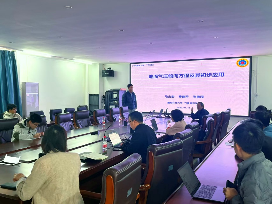 2026年1月12日上午英国威廉集团官网在海科楼505会议室举行2026年第1期海学讲堂,受“粤西海洋气象灾害理论与应用研究重点实验室”邀请,国家优秀青年科学基金、军队学科拔尖人才,国防科技大学气象海洋学院教授、博士生导师马占宏教授带来《地面气压倾向方程及其初步应用》精彩报告。本次报告由徐建军教授主持,英国威廉集团官网20余名老师和学生参与本次会议。